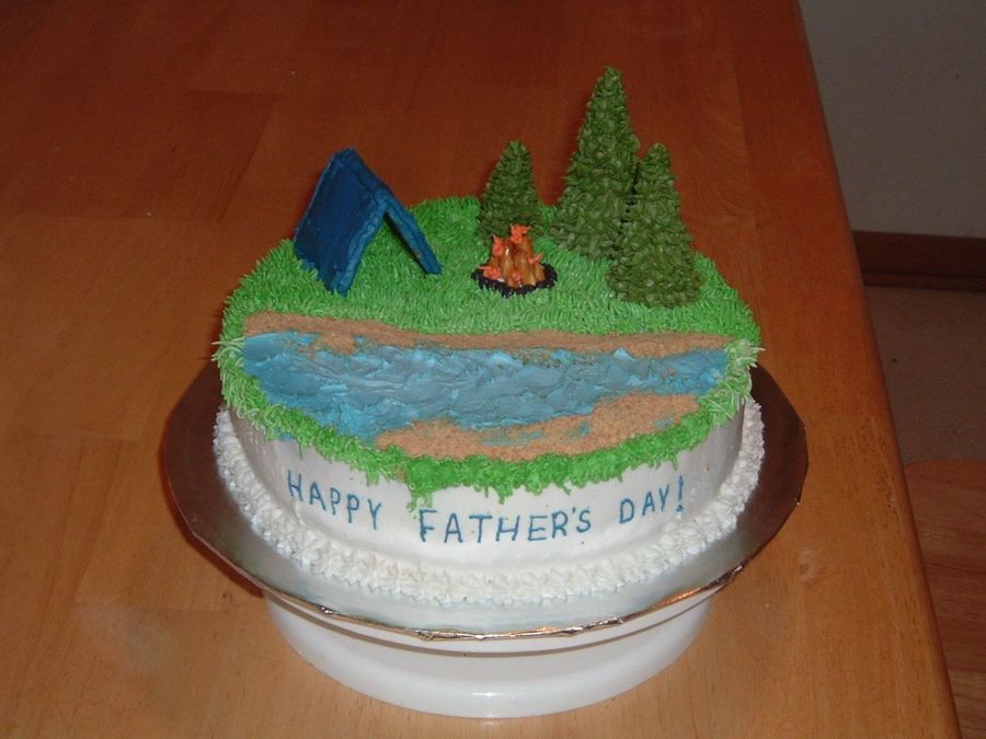 This was for all of the fathers in my family. Since they all like to camp, I thought I would do this for the theme on the cake. For the trees I used ice cream cones and bc frosting. This is my first contest entry!