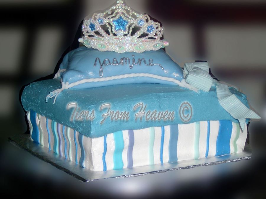 The cake buckled because it did not have enough support! Lesson learned. The pillow was originally iced in buttercream but my daughter dropped it and then my sister dropped a fridge shelf on it! So I had to go with Fondant and it made all the difference. Everything else is buttercream with fondant accents. The tiara was provided by the customer.