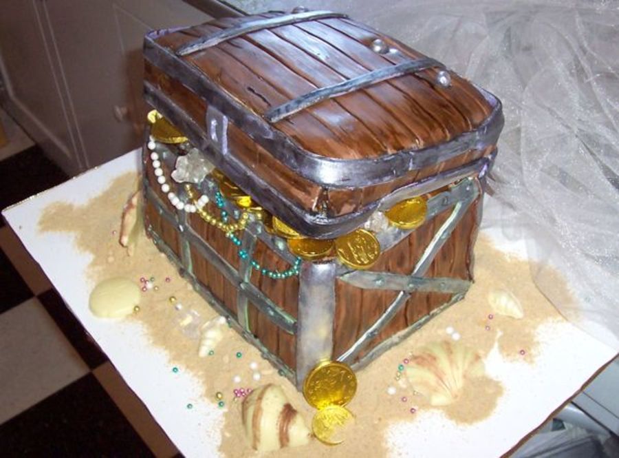 Thank-you! It took us from 8 am til 1 pm to do this cake, but that is with all the prep done the night before (icing, sand, chocolate shells, etc). It wasn't hard, in all honesty....fondant strips painted to look like old wood. The cake is a quarter sheet cut into halves, and stacked 2 layers high for the chest, and one layer high for the lid. The hard part was doing all the little nails, etc, and brushing the luster dust to make it look weathered.
