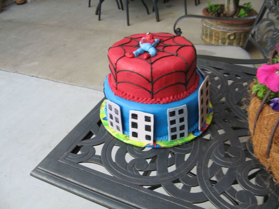 Thanks to all! The Spiderman is made out of fondant, but the buildings are made out of white chocolate that I tinted gray. I painted the windows using black icing color.