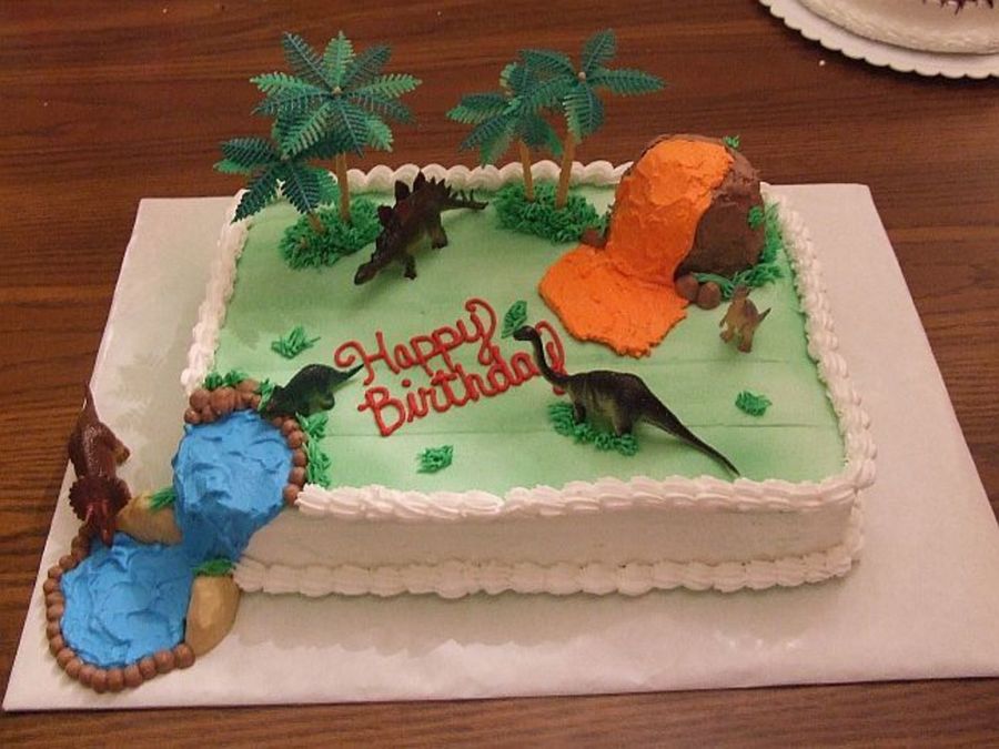 White cake with buttercream frosting. Spray food coloring for the top of the cake. I used a small measuring cup to make the volcano. Thank you to the the users I borrowed ideas from for this cake. I used plastic dinosaurs and trees to put on the cake.