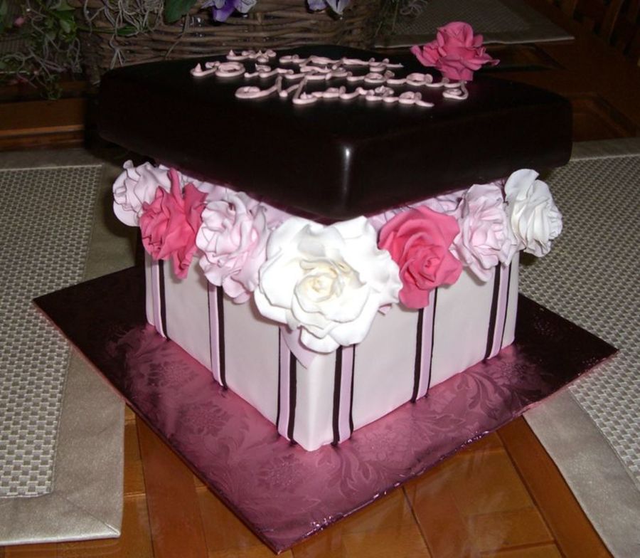 This was my first gift box cake and first gumpaste roses that I made for a friend's birthday. I was so busy this weekend, that I forgot to cut down the lid and left it way too big for the box. I didn't even notice it until I assembled the cake. Ooops! Amaretto cake with vanilla IMBC and fondant.