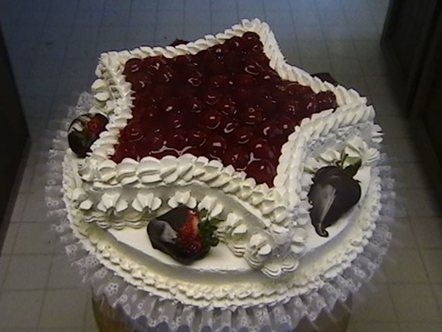 Star theme, simple and fast. Whipped icing with cherry filling on top, w/ chocolate dipped strawberry to fill in gaps. Dark chocolate cake.