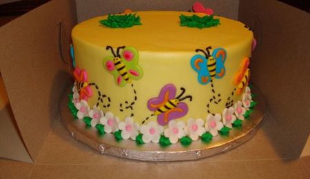 My clown cake from Course I, third class. Not that jazzed about it but it's practice and that's what it's all about. I wish I had done the clowns in solid colors but our instructor wanted us to practice striping a bag. I'm sure my 3-year old will love it :)