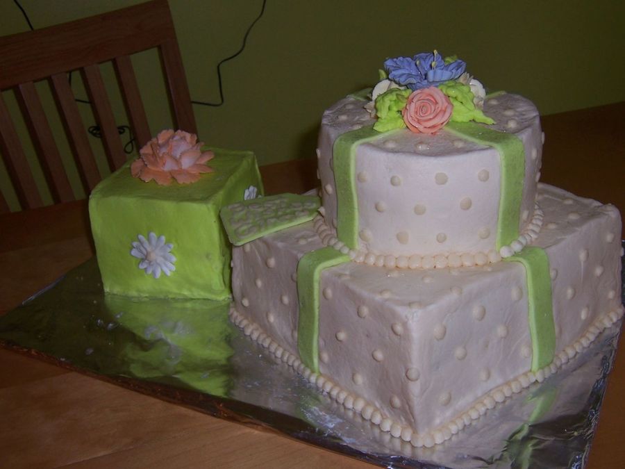 This is a shower cake I made. The wedding colors were lime and ivory. Most of the flowers were royal except for the large peach rose on the small package. It was buttercream. The ribbons were MMF.