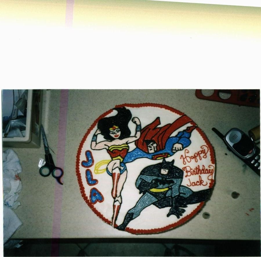 I made this for my son's birthday. He is wild about the Justice League. I wish I had known about BCT back then....this might have been a good candidate. Red Velvet cake with cream cheese frosting, piped design from a piping gel transfer....got the design from his JLA calendar. He was so excited!