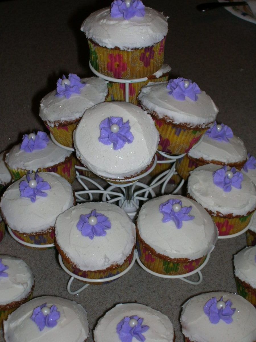 I did these little cakes for the women in my church. We had a potluck so I thought I would bring one of my favorite things CAKE! I didn't want to decorate a whole cake and my mom had just given me the mini cupcake tree as a gift so I opted for these little cupcakes. Lemon vanilla cake with 1/2 butter 1/2 crisco buttercream and edible pearls.