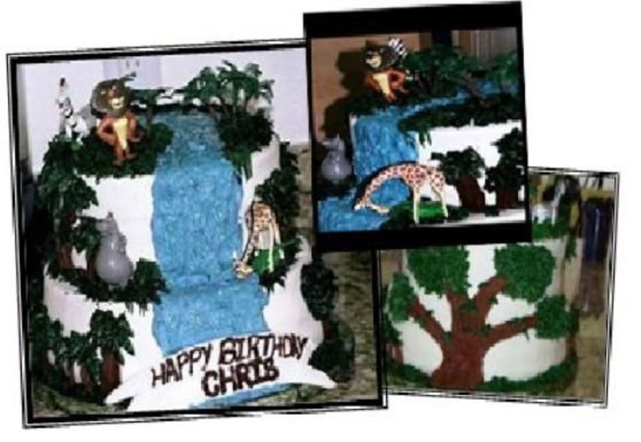 10" and 8" with trees, pond, waterfall and animals I got from grocery store bakery. This is one of my favorites!