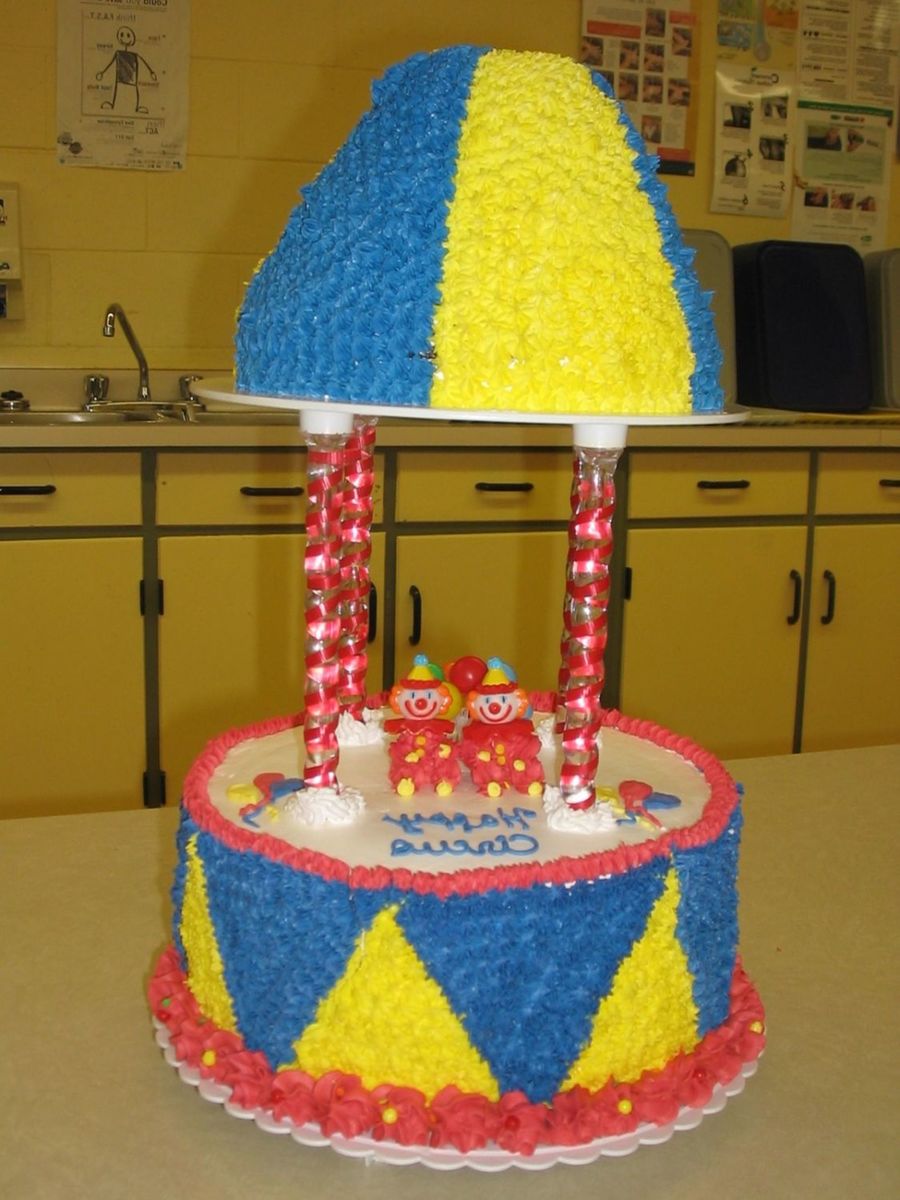 it was made with buttercream icing and the clowns to. it as for the school of my little boy circus show. they were all surprise to see a cake like that.