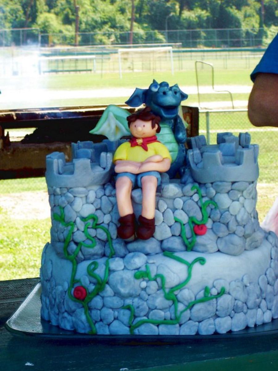 This was a cake that I donated to my son's Cub Scout Pack. The theme for the camp was fantasy so I sculpted an awesome dragon and a cub scout to sit next to him on a castle. The turrets are oreo cookies covered in fondant. Everything is edible. I wish I had a better pic of the dragon..he was soooo cute, he had iridescent scales that changed from teal to blue.