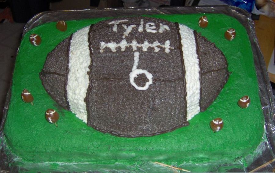This double layer chocolate cake is with a buttercream frosting for all decoration except for the black which is chocolate store bought frosting. The standing footballs were candles that were purchased at a local party store.