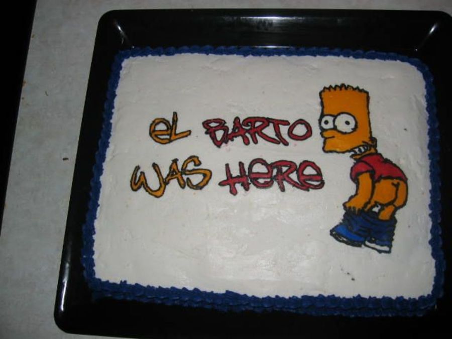 This was a cake I thought up to do for my 17th birthday. It was one of the first cakes I ever made. Everything was hand done & made out of buttercream icing including the writing and Bart Simpson. It took me 3 or 4 days to do.