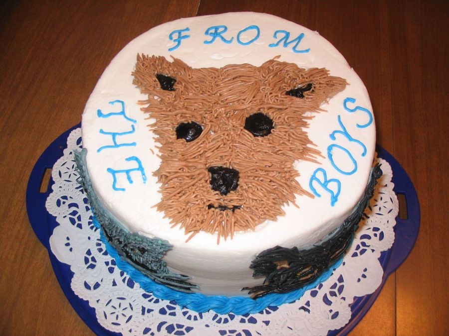 Did this for a coworker's wife's b-day. My interpretation of their dog and two cats. All buttercream. Used grass tip for fur.