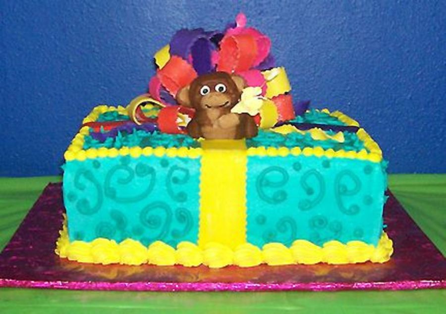 I made this for my daughter's 9th birthday. The cake is frosted with butter-cream w/a fondant monkey and bow. This was my first try making a monkey out of fondant. It kicked my rear-end!