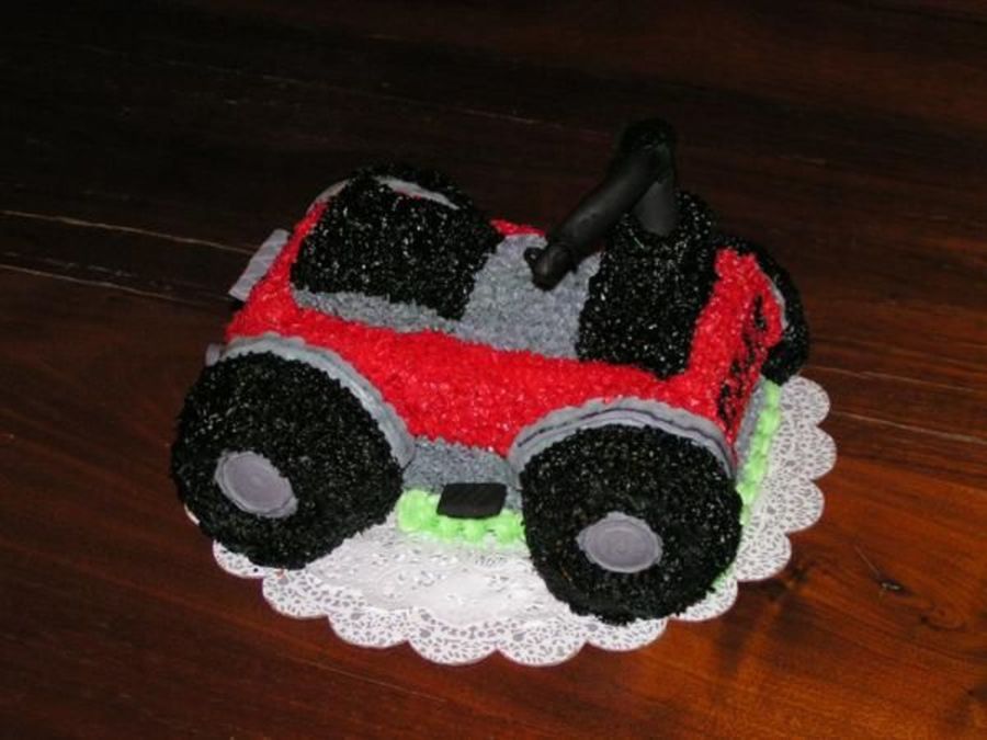 We baked a cake in a loaf pan. We then baked 4 mini round cakes to make the tires. For the seat we took some of the extra cake and built it up. The entire cake is done w/ a star tip. Handles, footboards, gas tank, and exhaust are done in black fondant! I hope this helps!