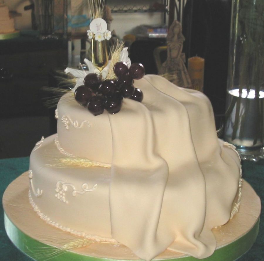 Esta torta es de primera comunion adornada con uvas naturales y espigas y un calis realizado de pastillaje.