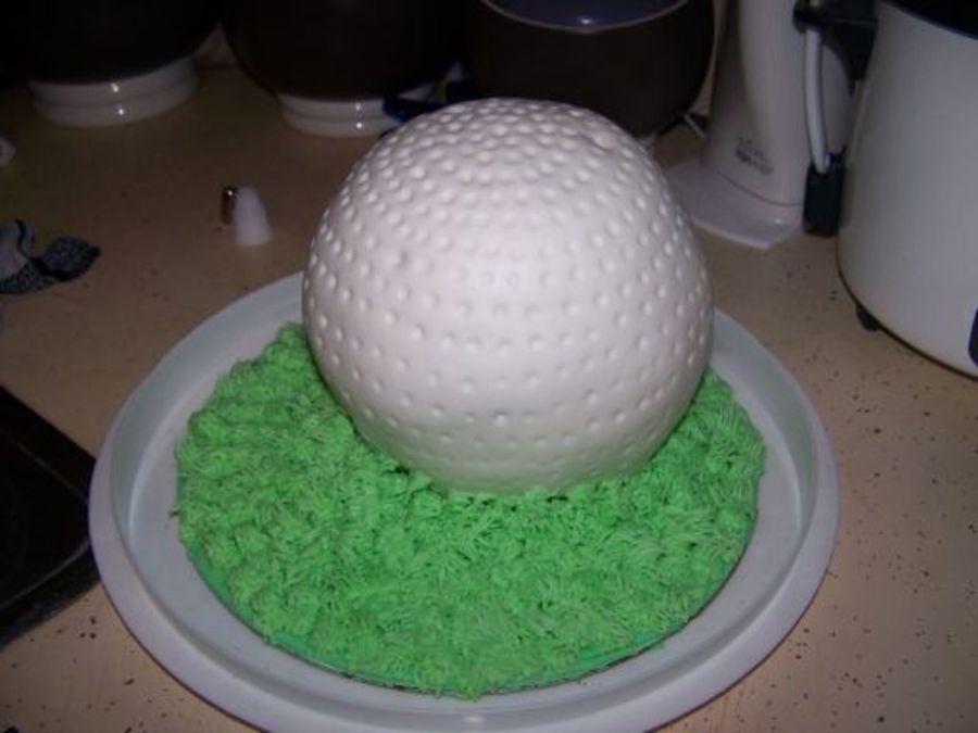 Made with Wilton sports ball pan. Covered in fondant, grass in stiff buttercream.