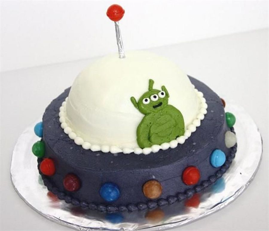 This UFO cake has lollipops for lights and an "LGM" (Little Green man) behind the steering wheel!