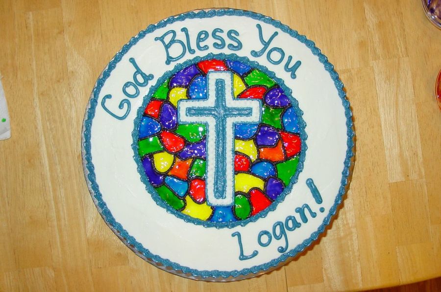 I LOVE this cake! It's for a First Communion, but could easily be used for a Baptism or Confirmation. The stained glass is made from colored piping gel -- I love the effect!