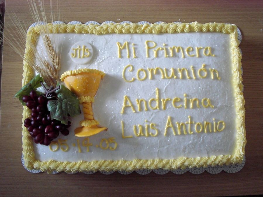 This cake is for 60 people. Made with vanilla sponge cake and buttercream icing. The grapes are plastic. The caliz is made with gum paste.