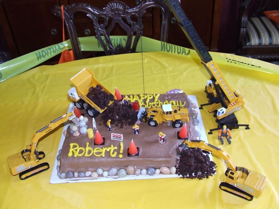 Chocolate cake, with shredded brownies for dumping. Candy rocks for border. Toys and cone candles to complete the scene.