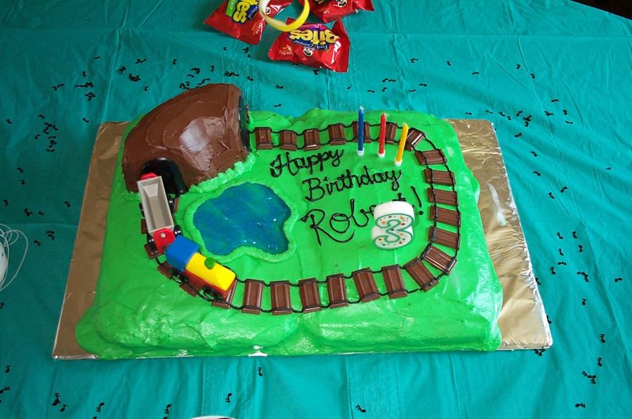 Section of bundt cake makes the tunnel, sections of Hershey bars and black icing make the tracks. Blue gel for lake.