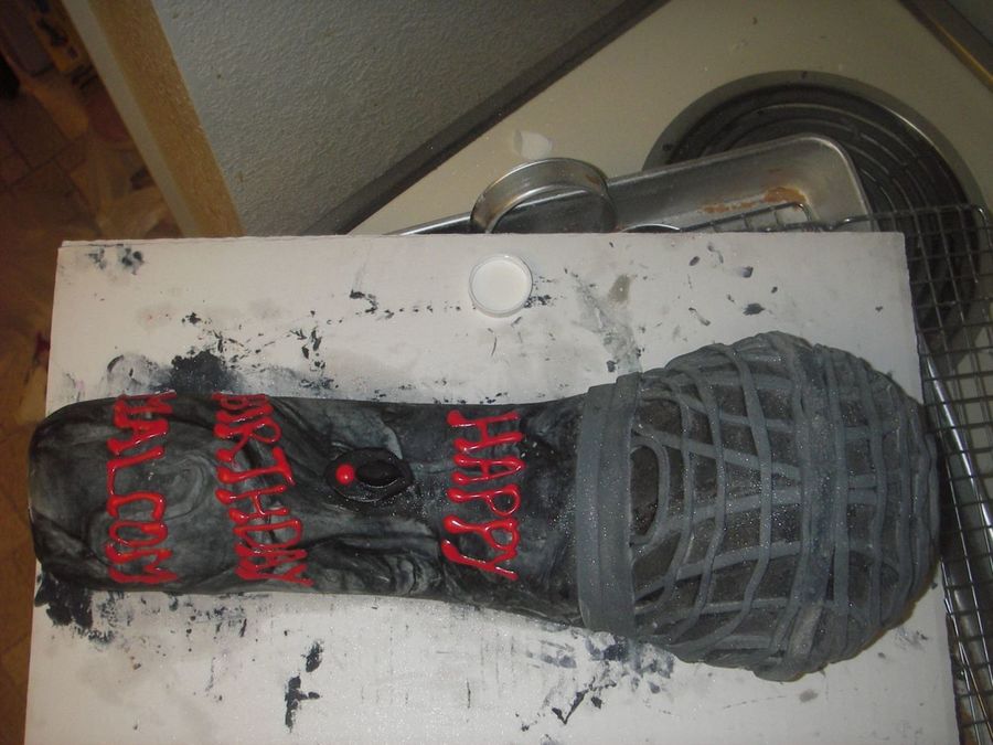 This is my second attempt at fondant. I made the mmf...YUM! I used the ball pan and then carved the rest out of sheet cake. For my second attempt at a shaped cake, i think i did pretty darn good. It was for a 17 year old kid that is pursuing singing...his birthday. I actually moved it to a silver foiled covered board and added a "cord" to it so it was not nearly as messy looking, didnt get a pic of that though :(