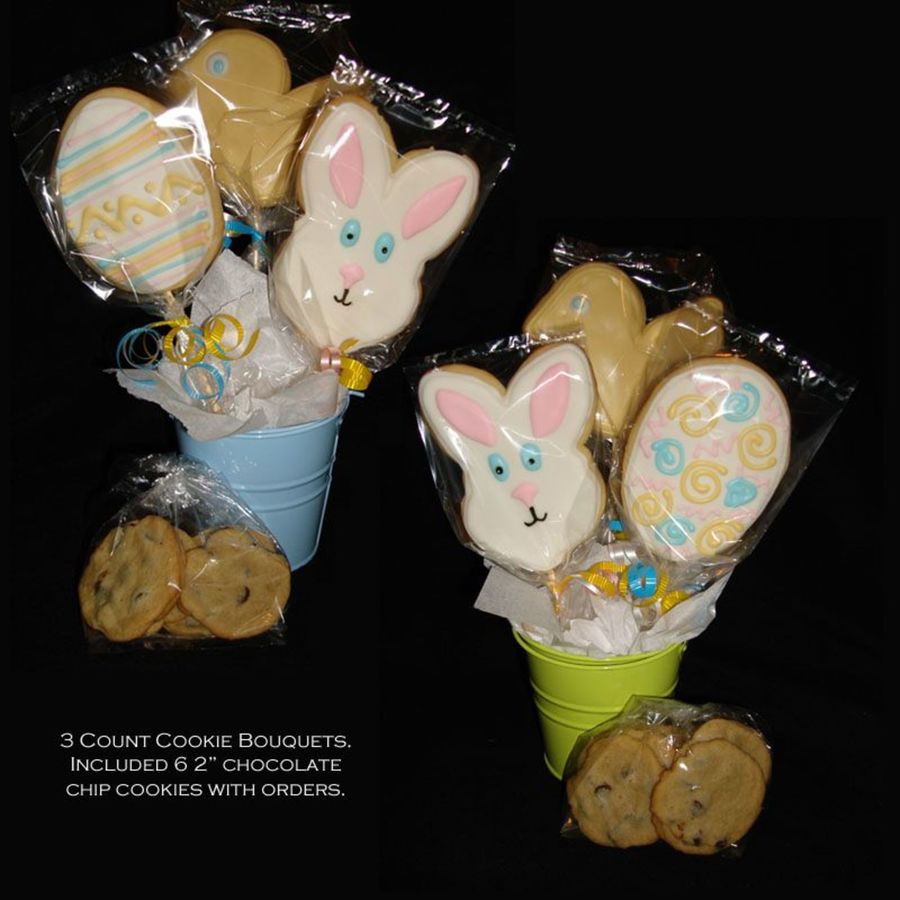These are two variations of the cookie boquets that I did for easter. I found the tins at Wal-mart for $1.00 a piece and loaded up on them. On this order I also included 6-2" chocoalte chip cookies, I had originally planned on putting them in the tin also, but didn't want them to dry out so I will have to figure out something else for next time.