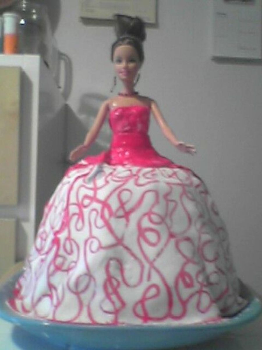 Birthday cake which I made for my friend, who is Barbie and fashion fan. Skirt is made of two cakes: chocolate sponge base and vanilla sponge top, both cakes are torted with mascarpone, qiumiq, philadelphia kind of cheese and gooseberry gelly cream. The skirt cover is painted MMF. That's my first doll cake :D