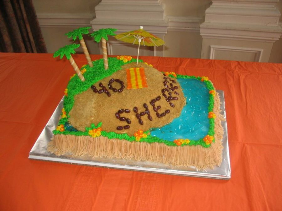 This cake was my first attempt at palm trees. I learned why not to use rolled wafer cookies to make the trunks. They didn't last very long. I set the cake up at 3pm and by the time of my friend's party, the trees looked like a hurricane hit them. My friend was still happy with the cake. The palm leaves are royal icing, the sand is graham cracker crust, the water is piping gel, and the rest is The island was a 10" circle atop a 1/2 sheet cake. The name and age are Dr Pepper Jelly Bellies. My friend loves DP