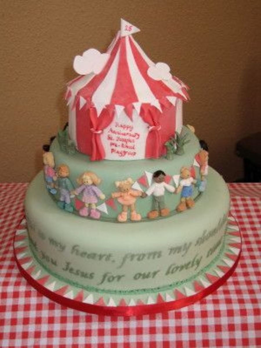 Cake for my son's Pre-school Playgroup 25th Anniversary Garden Party. Fondant covered: rich fruit cake for bottom tier, chocolate cake for middle tier, & lemon cake for top tier. Prayer cut out with FMM tappits, children made with help of Sculpey Moulds.