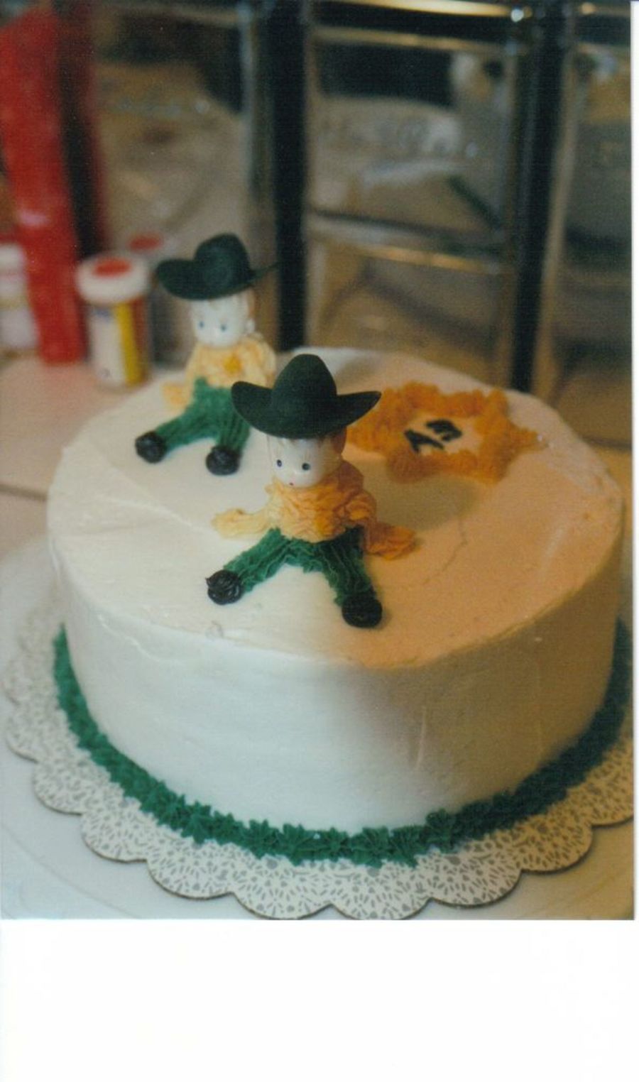 Spice cake, buttercream. I didn'tl like the clowns. My duaghter is a deptuy sheriff. I got some little boy doll heads from the cake store, bought 2 little cowboy hats from Micheaels and painted them green then made the bodies in t the sheriffs uniform color. The star has her beat number
