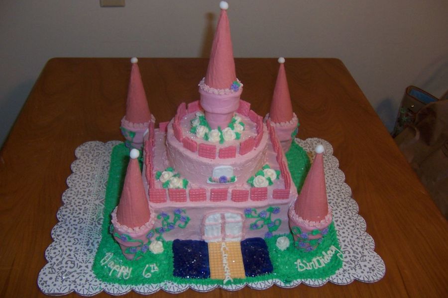 Here is a pic of a castle cake I made for my friends 6 year old. Its iced in butterceam, and the tourettes are made of 2 differnt kinds of ice cream cones, the top of them are painted in pink white chocolate