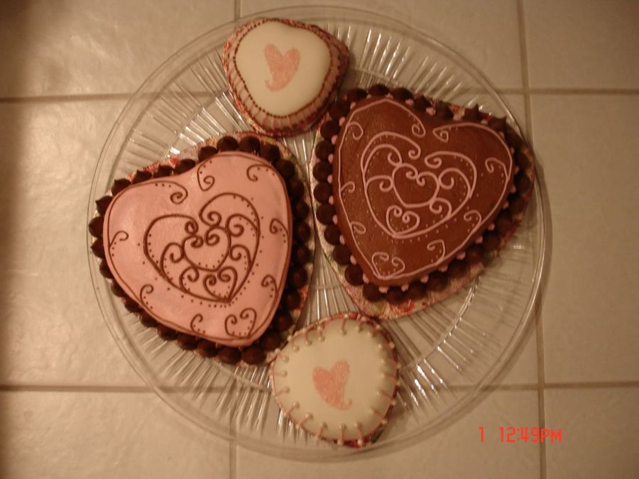 Cakes my sister and I did for my parent's anniversary. The pink cake is german chocolate and the brown cake is chocolate. Hershey kisses around the base (thanks to my sil for that idea). My first attempt at scroll work without a press. The small cakes are fondant covered and my sister used a stencil and pink sugar to make the adorable hearts on top. Lot of fun working with my lil sis!