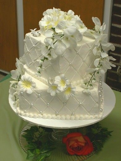 The second cake I made for my daughter's bridal shower. It started out as a gift box cake, and sort of ended up being a mini-wedding cake. These were 8" and 6" squares. The flowers were silk except for the rose at the base.