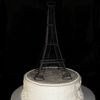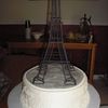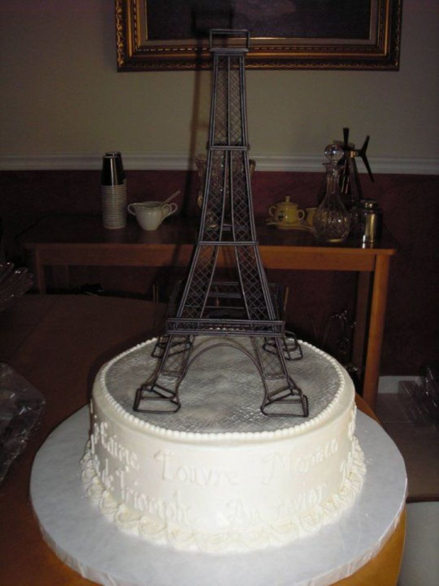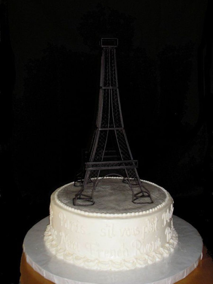 Sure didn't want to attempt a tower out of royal icing and I got lucky and found what used to be a lamp. So I found a bunch of French words and wrote them on the side of the cake. It was really hard to take a picture with all the stuff in the background and when I put a blakc drape behind it the tower blended into it but I think you get the idea. It was a big hit. Lemon cake with raspberry fillling and BC.