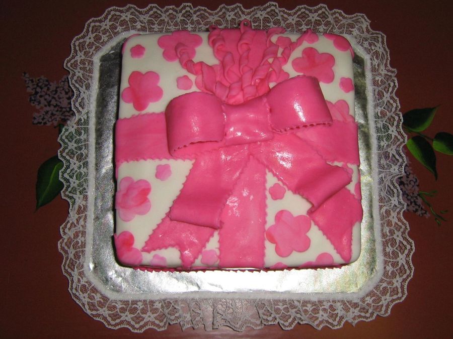 I made this cake for a friend's daughters birthday. It is alot like the cake I did in the Wilton Classes. It is done in fondant , I brushed the bow and ribbon with vanilla extract it gave the them glossy affect