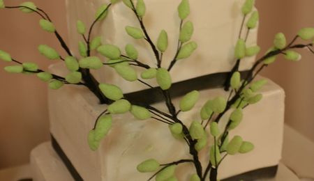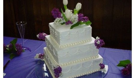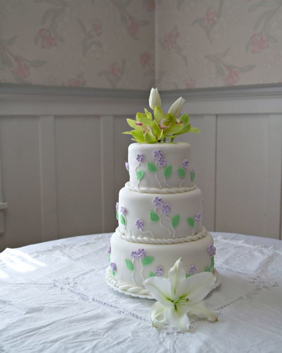 I didn't like their choice of cake toppers. First it was the flowers, then they did a tacky cake topper. Oh well, can't help all of them! It was their cake ;). Here is the full view of the cake. Rolled fondant with royal icing flowers. Size is 6, 8 10".