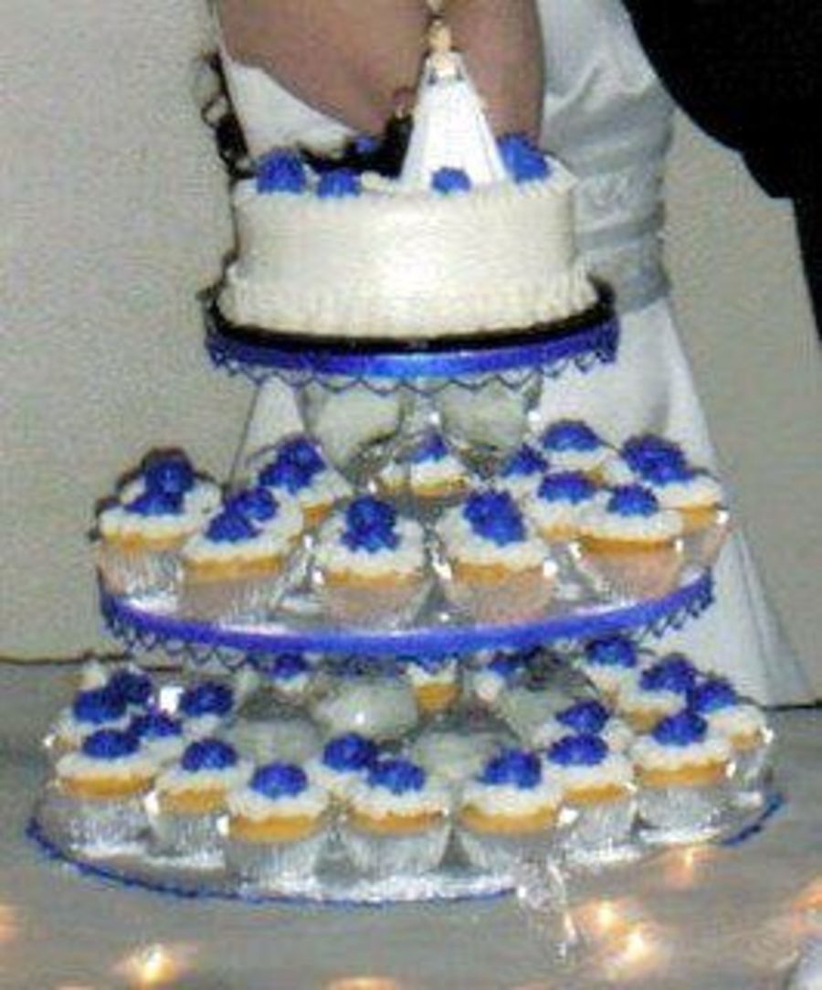 sorry about the blurred pic.Royal blue roses top white icing in silver foil cups.Top cake shines with the same butter cream icing and rows of ribbon and lace designs along edges