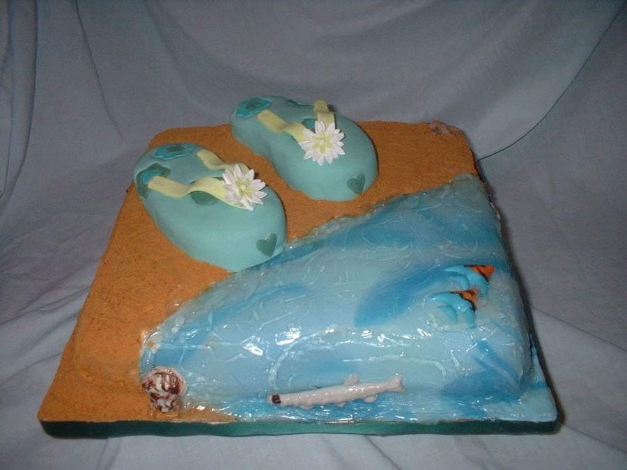 FlipFlops on the beach; chocolate fish swimming; sandy beach is graham cracker crumbs on buttercream
