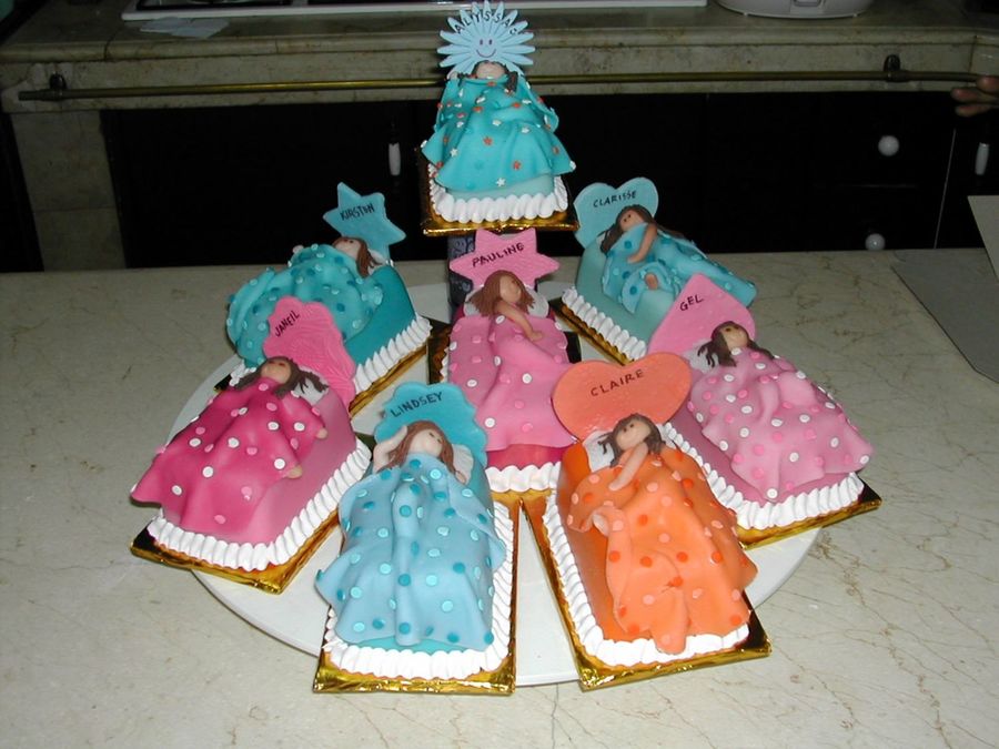 My daughter Alyssa turned 14 and had a sleep-over party with 7 friends. Each girl had her own personalized "bed" cake baked from mini loaf pans. Figures were made from fondant and gumpaste; headboards are made of gumpaste using cookie/flower cutters. The girls stayed up all night!