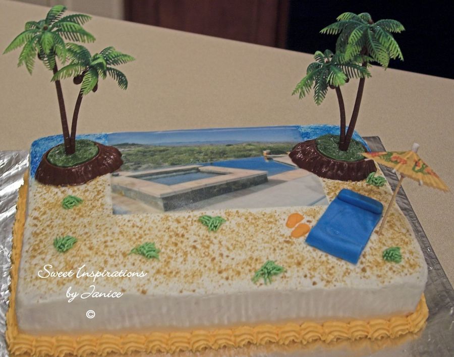 Woohoo! This is my first cake order for a lady who's having a pool party. This is the actual pool where the party will be and it's an edible image. It's a two layer fudge marble on bottom with buttercream filling and chocolate on top, fondant accents and graham crackers as sand. Thanks to lisa, Ladycake, and KarenOR for your ideas. I didn't get to make the pretzel palm trees, so I just used store bought ones. Hope you like it! Thanks!