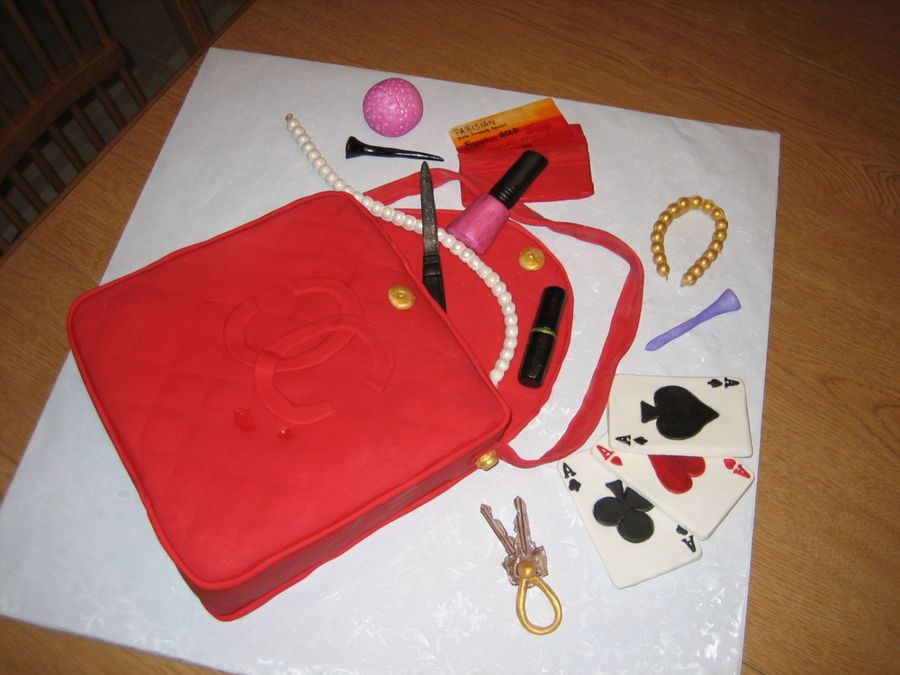 This is a red purse cake made from yellow cake and covered with red fondant. All of the accessory pieces were created from gum paste and/or fondant and were colored with various petal dusts and gels.