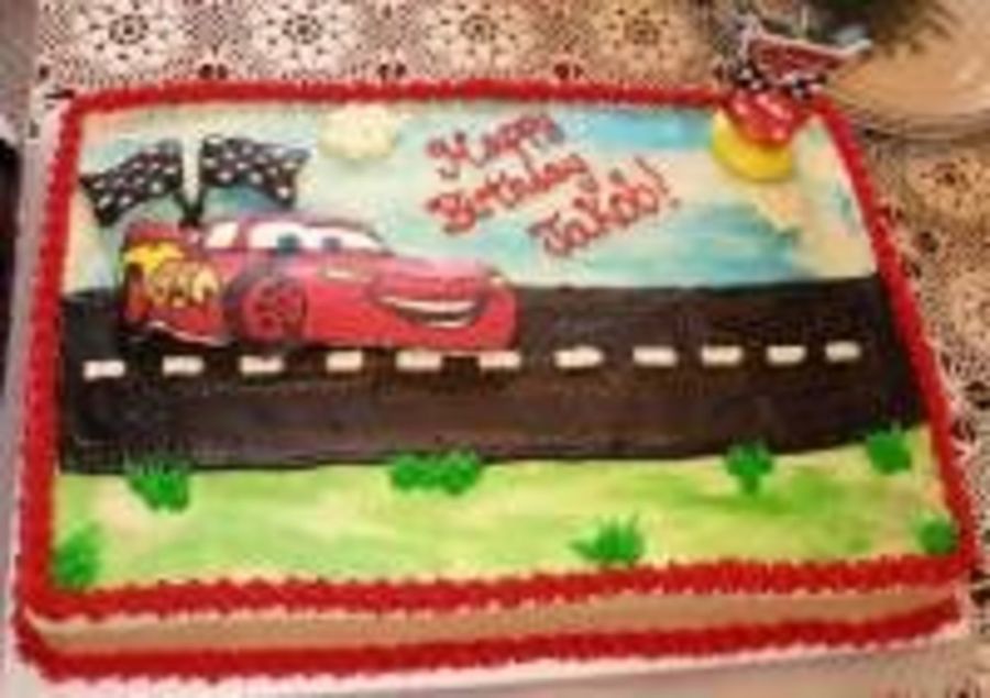 This is a cake I made for a close family friend. It is from the Car Movie. It hink I used a combination of ideas from the Wilton Yearbook and pictures on here to design the cake. It's iced in all buttercream and Lightening McQueen and the flags are buttercream transfers