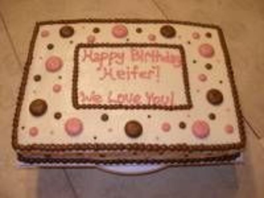 This is a birthday cake I made for a friend. I do believe "Heifer" is spelled wrong, but this is how they wanted it spelled?? I double-checked...It is all buttercream with pink and brown dots.
