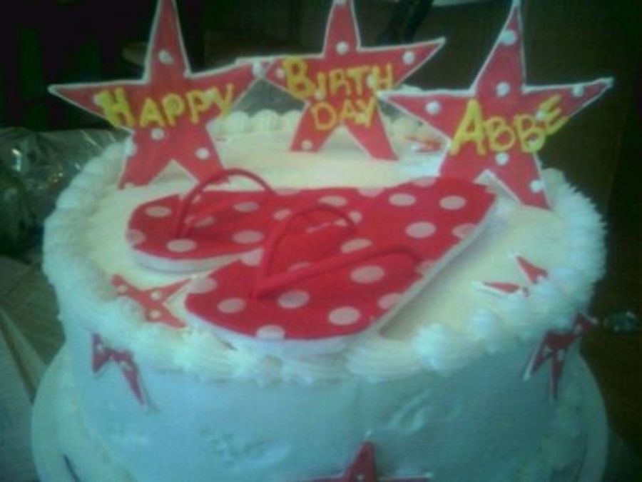 this girls favorite pair of shoes are here red flip flops with polka dots, so i recreated them in fondant, i also made footprint stamps for the sides and made a walking footprint all the way around