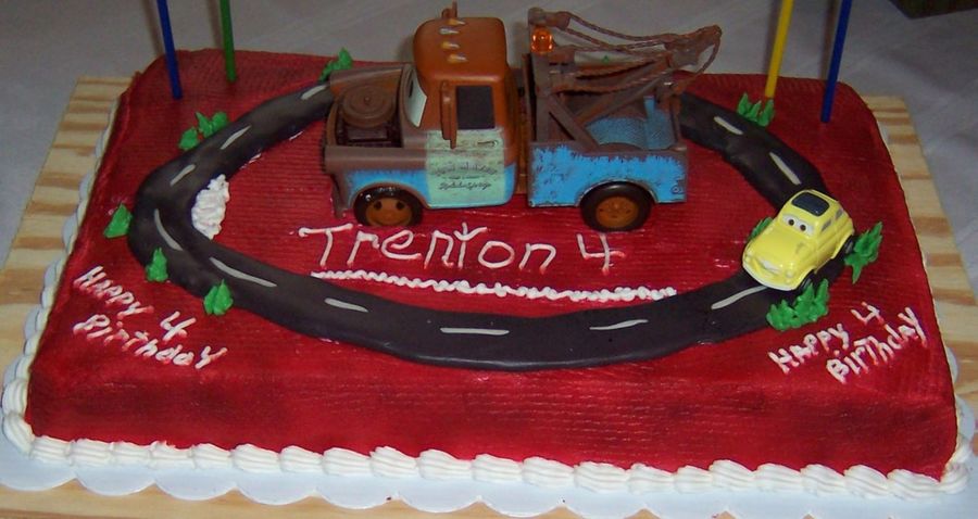 This was a quick birthday cake for my 4 year grandson.Mater is scale car I purchased for his birthday present.