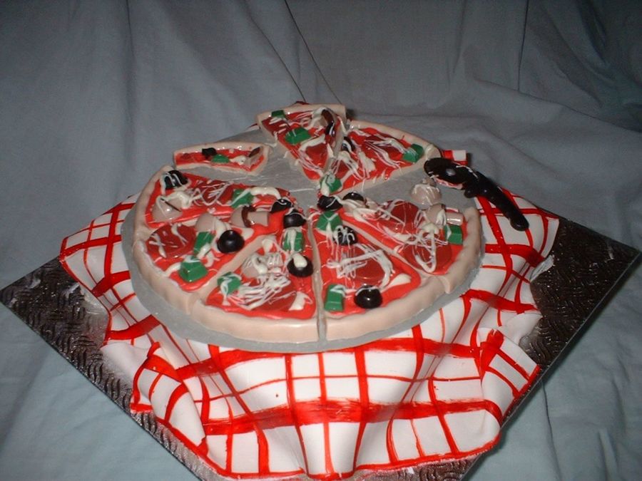 12X12 inch cake serving as a table to hold a 'pizza, all dressed'; Italian tablecloth is rolled fondant with red pattern painted with red gel color disolved in vodka; the pizza & the baking dish are made completely out of chocolate (the hardest color to make was the reddish-brown for the pepperoni. Pizza is sliced, one slice is partially eaten & 'someone' discarded a mushroom ! (you must serve one of these for dessert on Family Pizza Night!)