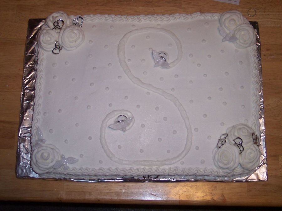I was asked to do a cake for a wedding shower, another first, and no one knew the colors or anything...we did figure out the last name...so i did white on white with there initial....I thought it turned out pretty well.....still woking on the roses and everything but practice makes perfect.........right?!?!