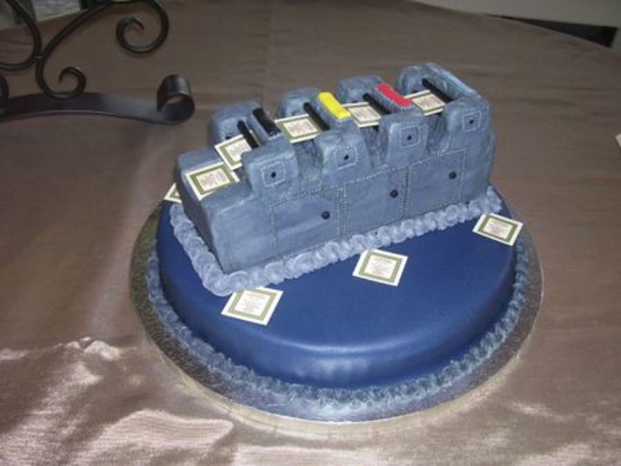 this is a four color printing press made for dh's boss. he owns a printing company and my dh is his graphic designer. he insisted on having a printing press and this is the best i could do. lol!! btw it was his grooms cake. the press is atop a single layer 14 in round covered in blue mmf ( the color of thier carpet).